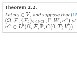 - (iii) ${u^{\alpha }}(t)$ is ${\mathcal{F}_{t}}$-adapted for all $t\in [0,T]$, and for all $1\le p<\infty $, ${u^{\alpha }}$ belongs to ${L^{p}}(\Omega ,\mathcal{F},\{{\mathcal{F}_{t}}\},\mathbb{P};{L^{2}}(0,T;D(A)))\cap {L^{p}}(\Omega ,\mathcal{F},\{{\mathcal{F}_{t}}\},\mathbb{P};{L^{\infty }}(0,T;V))$.