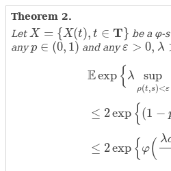 \[ \mathbb{E}\exp \Big\{\lambda \underset{t\in \mathbf{T}}{\sup }|X(t)|\Big\}\le 2Q(\lambda ,\theta ),\]Corollary 1.