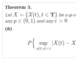 Theorem 3 suggests a way to check if a given φ-sub-Gaussian process is sample continuous. Indeed, under the conditions of Theorem 3, if the right hand side of Formula (8) tends to 0 for $\varepsilon \to 0$, then $P\Big\{{\sup _{\rho (t,s)<\varepsilon }}|X(t)-X(s)|>x\Big\}\to 0$. Therefore, as $\varepsilon \to 0$, ${\sup _{\rho (t,s)<\varepsilon }}|X(t)-X(s)|\to 0$ in probability, but also (due to the monotonicity of the supremum) with probability 1. This would entail the sample continuity of the process $X=\{X(t),t\in \mathbf{T}\}$ with probability 1. Theorem 3 is specified below for particular cases of σ. For example, from Corollary 5 below we can see that for $\sigma (h)=c{h^{\beta }}$ with $c>0$, $0<\beta \le 1$, and $\varphi (x)=\frac{|x{|^{\alpha }}}{\alpha }$, $1<\alpha \le 2$ (in which case ${\varphi ^{\ast }}(x)=\frac{|x{|^{\gamma }}}{\gamma }$, $\gamma \ge 2$ and $\frac{1}{\alpha }+\frac{1}{\gamma }=1$), the convergence to zero of the right hand side of Formula (8) holds. Therefore, in this case one can conclude that the process is sample continuous with probability 1.