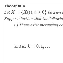 Let $a(t)$, $t\ge 0$, be a continuous strictly increasing function such that $a(t)>0$ and $a(t)\to \infty $ as $t\to \infty $. Introduce the sequence ${b_{0}}=0,{b_{k+1}}>{b_{k}},{b_{k}}\to \infty ,k\to \infty $. Denote ${B_{k}}=[{b_{k}},{b_{k+1}}],k=0,1,\dots \hspace{0.1667em}$, ${a_{k}}=a({b_{k}})$, ${\varepsilon _{k}}={\sup _{t\in {B_{k}}}}{\tau _{\varphi }}(X(t))$, and suppose that $0<{\varepsilon _{k}}<\infty $.