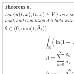 \[\begin{array}{l}\displaystyle {\int _{\mathbb{R}}}{\Big(\ln (1+|\lambda |)\Big)^{2\beta }}F(d\lambda )<\infty ;\\ {} \displaystyle A={\sum \limits_{k=0}^{\infty }}\frac{{\varepsilon _{k}}}{{a_{k}}}<\infty ;\\ {} \displaystyle {\widehat{S}_{2}}(\theta )={\sum \limits_{k=0}^{\infty }}\frac{{\varepsilon _{k}}}{{a_{k}}}\Big\{\ln \Big(\frac{{b_{k+1}}-{b_{k}}}{2}\Big)+\frac{\beta }{\beta -1}{\Big(\frac{{c_{\eta }}{c_{2}}(\beta )}{\theta {\varepsilon _{k}}}\Big)^{1/\beta }}\Big\}<\infty ,\end{array}\]