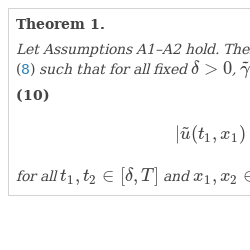 Let Assumptions A1–A2 hold. Then there exists a version $\tilde{u}(t,x)$ of the random function $u(t,x)$ defined by (8) such that for all fixed $\delta >0$, ${\widetilde{\gamma }_{2}}<1/4\wedge (\beta (\sigma )-1/2)$ and ${\widetilde{\gamma }_{1}}<1-1/(2\beta (\sigma ))$, ${\widetilde{\gamma }_{1}}\le \beta ({u_{0}})$, we have for all ${t_{1}},{t_{2}}\in [\delta ,T]$ and ${x_{1}},{x_{2}}\in [0,L]$ and for some constant ${C_{\tilde{u}}}(\omega )>0$.