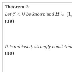 Let $\beta <0$ be known and $H\in (1/2,1)$. The MLE for α is It is unbiased, strongly consistent and normal:
