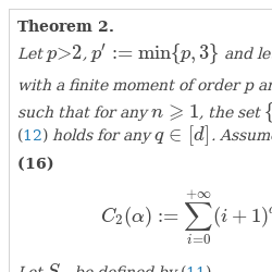 Since $n\geqslant {n_{0}}$, we derive, in view of (17), In order to bound $(II)$, we argue as in [28] (p. 456). Doing similar computations as in [9] (p. 272), we obtain that where ${a_{n}}:=\| {S_{n}^{(m)}}{\| _{2}}{\sigma ^{-1}}\| {b_{n}}{\| _{{\ell ^{2}}}^{-1}}$. Observe that for any n, by (P.3), and using again (P.3) combined with Theorem 1 for $p=q=2$, This leads to the estimate and since $n\geqslant {n_{0}}$, we derive, in view of (17),