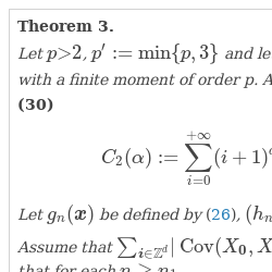 If (12), ${\lim \nolimits_{n\to +\infty }}\| {b_{n}}{\| _{{\ell ^{2}}}}=+\infty $ and the family ${({\delta _{\boldsymbol{i},2}})}_{\boldsymbol{i}\in {\mathbb{Z}^{d}}}$ is summable, then the sequence ${({\varepsilon _{n}})}_{n\geqslant 1}$ converges to 0 hence ${n_{0}}$ is well defined. However, it is not clear to us whether the finiteness of ${C_{2}}(\alpha )$ combined with (12) and ${\lim \nolimits_{n\to +\infty }}\| {b_{n}}{\| _{{\ell ^{2}}}}=+\infty $ imply that ${\sum _{\boldsymbol{j}\in {\mathbb{Z}^{d}}}}|\mathbb{E}[{X_{\mathbf{0}}}{X_{\boldsymbol{j}}}]|$ is finite. Nevertheless, we can show an analogous result in terms of coefficients ${\delta _{\boldsymbol{i},p}}$ with the following changes in the statement of Theorem 2: In this case, the convergence of ${\sum _{\boldsymbol{i}\in {\mathbb{Z}^{d}}}}|\operatorname{Cov}({X_{\mathbf{0}}},{X_{\boldsymbol{i}}})|$ holds (cf. Proposition 2 in [11]).