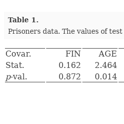 The data are given in [1]. They consist of 432 male inmates who were released from Maryland state prisons in the early 1970s. These men were followed for 1 year after their release, and the dates of any arrests were recorded. Time is measured by the week of the first arrest after release. There were seven covariates: financial aid after release (FIN; 0 – no, 1 – yes), age in years at the time of release (AGE), race (RACE; 1 – black, 0 – otherwise), full-time work experience before incarceration (WEX; 1 – yes, 0 – no), marital status (MAR; 1 – was married at the time of release, 0 – otherwise), released on parole (PAR; 1 – released on parole, 0 – otherwise), convictions prior to incarceration (PRI).