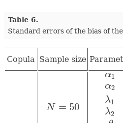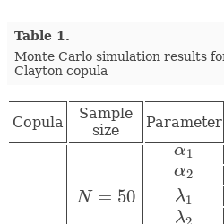 | Clayton | $N=50$ | ${\alpha _{1}}$ | 0.6 | 0.01987 | −0.06159 | 0.00903 | −0.01671 | – | – |