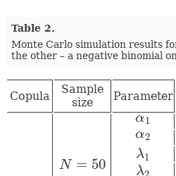 where $k,l=0,1,...$, ${\lambda _{j}}\mathrm{>}0$, $j=1,2$, $\beta \mathrm{>}0$. Then, for each $j=1,2$, the marginal distribution of ${R_{j,t}}$ is negative binomial with parameters β and ${p_{j}}=\beta /({\lambda _{j}}+\beta )$ and $\mathbb{E}{R_{j,t}}={\lambda _{j}}$, $\mathbb{V}\mathrm{ar}({R_{j,t}})={\lambda _{j}}(1+{\beta ^{-1}}{\lambda _{j}})$, $\mathbb{C}\mathrm{ov}({R_{1,t}},{R_{2,t}})={\beta ^{-1}}{\lambda _{1}}{\lambda _{2}}$. Thus, bivariate negative binomial distribution is more flexible than bivariate Poisson due to overdispersion parameter β.Assume now that the Poisson innovations ${R_{1,t}}$ and ${R_{2,t}}$ with parameters ${\lambda _{1}}$ and ${\lambda _{2}}$, respectively, are linked by a copula with the dependence parameter θ. Taking into account equality (14), we can estimate θ by minimizing the sum of squared differences where