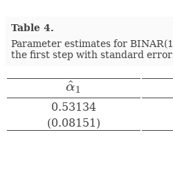 BINAR(1) models can be estimated via conditional maximum likelihood (CML) (see [18] and [10]). The conditional distribution of the BINAR(1) process is: