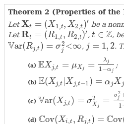 Let ${\textbf{X}_{t}}={({X_{1,t}},{X_{2,t}})^{\prime }}$ be a nonnegative integer-valued time series given in Def. 1 and ${\alpha _{j}}\in [0,1)$, $j=1,2$. Let ${\textbf{R}_{t}}={({R_{1,t}},{R_{2,t}})^{\prime }}$, $t\in \mathbb{Z}$, be nonnegative integer-valued random variables with $\mathbb{E}({R_{j,t}})={\lambda _{j}}$ and $\mathbb{V}\mathrm{ar}({R_{j,t}})={\sigma _{j}^{2}}\mathrm{<}\infty $, $j=1,2$. Then the following properties hold: