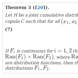 Let H be a joint cumulative distribution function (cdf) with marginal distributions ${F_{1}},{F_{2}}$. Then there exists a copula C such that for all $({x_{1}},{x_{2}})\in {[-\infty ,\infty ]^{2}}$: If ${F_{i}}$ is continuous for $i=1,2$ then C is unique; otherwise C is uniquely determined only on $\mathrm{Ran}({F_{1}})\times \mathrm{Ran}({F_{2}})$, where $\mathrm{Ran}(F)$ denotes the range of the cdf F. Conversely, if C is a copula and ${F_{1}},{F_{2}}$ are distribution functions, then the function H, defined by equation (7) is a joint cdf with marginal distributions ${F_{1}},{F_{2}}$.