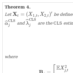 where \[\begin{aligned}{}{\mathbf{B}_{j}}& ={\left[\begin{array}{c@{\hskip10.0pt}c}\mathbb{E}{X_{j,t}^{2}}& \mathbb{E}{X_{j,t}}\\ {} \mathbb{E}{X_{j,t}}& 1\end{array}\right]^{-1}}{\mathbf{A}_{j}}{\left[\begin{array}{c@{\hskip10.0pt}c}\mathbb{E}{X_{j,t}^{2}}& \mathbb{E}{X_{j,t}}\\ {} \mathbb{E}{X_{j,t}}& 1\end{array}\right]^{-1}},\\ {} {\mathbf{A}_{j}}& ={\alpha _{j}}(1-{\alpha _{j}})\left[\begin{array}{c@{\hskip10.0pt}c}\mathbb{E}{X_{j,t}^{3}}& \mathbb{E}{X_{j,t}^{2}}\\ {} \mathbb{E}{X_{j,t}^{2}}& \mathbb{E}{X_{j,t}}\end{array}\right]+{\sigma _{j}^{2}}\left[\begin{array}{c@{\hskip10.0pt}c}\mathbb{E}{X_{j,t}^{2}}& \mathbb{E}{X_{j,t}}\\ {} \mathbb{E}{X_{j,t}}& 1\end{array}\right],\hspace{1em}j=1,2.\end{aligned}\]