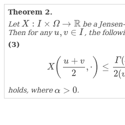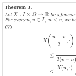 \[ X\bigg(\frac{u+v}{2},\cdot \bigg)\le \frac{1}{v-u}{\underset{u}{\overset{v}{\int }}}X(t,\cdot )dt\le \frac{X(u,\cdot )+X(v,\cdot )}{2}\hspace{2.5pt}\textit{(a.e.)}\]