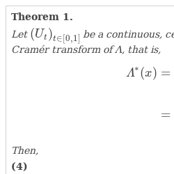 \[ \varLambda (\lambda )=\log \mathbb{E}\big[\exp \big(\langle U,\lambda \rangle \big)\big]=\frac{1}{2}{\int _{0}^{1}}{\int _{0}^{1}}k(t,s)\hspace{0.1667em}d\lambda (t)d\lambda (s),\]