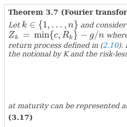 \[ V=\frac{nK{e}^{-rT}}{2\pi }{\int _{{0}^{+}}^{\infty }}\frac{1+iy\varrho -{e}^{iy\varrho }}{{y}^{2}}{F_{y}}{(\sigma )}^{n-1}{F^{\prime }_{y}}(\sigma )\hspace{0.1667em}dy\]