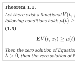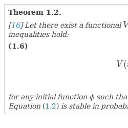 [16] Let there exist a functional $V(t,\varphi )\in D$ such that for any solution $x(t)$ of Equation (1.2) the following inequalities hold: for any initial function ϕ such that $\mathbf{P}(\| \phi {\| _{0}}\le \delta )=1$, where $\delta >0$ is small enough. Then the zero solution of Equation (1.2) is stable in probability.