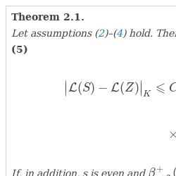 \[\begin{aligned}{\big|\mathcal{L}(S)-\mathcal{L}(Z)\big|_{K}}& \leqslant C\frac{\,{\max _{j}}{w_{j}}}{\,{\min _{j}}{w_{j}}}{\Bigg({\sum \limits_{i=1}^{N}}{n_{i}}{\tilde{u}_{i}}\Bigg)}^{-1/2}\\{} & \hspace{1em}\times {\sum \limits_{k=1}^{N}}\bigg[{\nu _{3}^{+}}({F_{k}})+{\nu _{1}^{+}}({F_{k}}){\nu _{2}^{+}}({F_{k}})+{\big({\nu _{1}^{+}}({F_{k}})\big)}^{3}\\{} & \hspace{1em}+\frac{{({\nu _{2}^{+}}({F_{k}})-{({\nu _{1}^{+}}({F_{k}}))}^{2})}^{2}}{{\nu _{1}^{+}}({F_{k}})}\bigg]{\tilde{u}_{k}^{-1}}.\end{aligned}\]Remark 2.1.