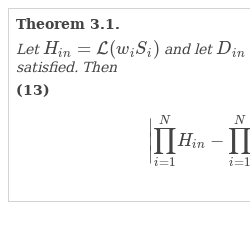 \[ {\Bigg|{\prod \limits_{i=1}^{N}}{H_{in}}-{\prod \limits_{i=1}^{N}}{D_{in}}\Bigg|}_{K}\leqslant C(N,{k_{0}})\frac{\max {w_{i}}}{\min {w_{i}}}\cdot \frac{{\textstyle\sum _{i=1}^{N}}{\overline{q}_{i}}({p_{i}}+{\overline{q}_{i}})}{\sqrt{{\textstyle\sum _{k=1}^{N}}\max ({n_{k}}{\overline{q}_{k}},1)}}.\]Remark 3.1.