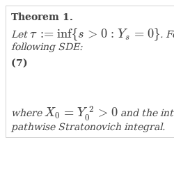 Consider the process $Y=\{Y_{t},t\ge 0\}$ that satisfies the following SDE until its first zero hitting: