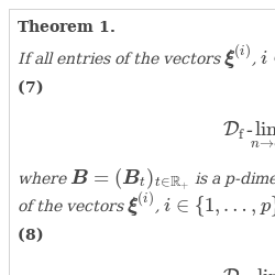 where $\boldsymbol{B}=(\boldsymbol{B}_{t})_{t\in \mathbb{R}_{+}}$ is a p-dimensional zero mean Brownian motion satisfying $\operatorname{Var}(\boldsymbol{B}_{1})=\boldsymbol{V}$. If all entries of the vectors ${\boldsymbol{\xi }}^{(i)}$, $i\in \{1,\dots ,p\}$, and $\boldsymbol{\varepsilon }$ have finite third moments, then