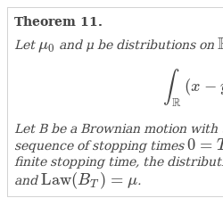 □Let us also recall that T is a minimal stopping time if any stopping time $R\le T$ with $\operatorname{Law}(B_{R})=\operatorname{Law}(B_{T})$ satisfies $R=T$ a. s.
