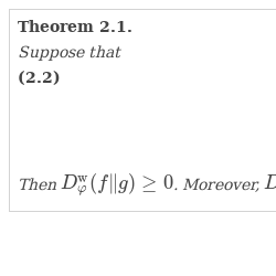 \[{D_{\varphi }^{\mathrm{w}}}(f\| g)=\int _{\mathcal{X}}\varphi (\mathbf{x})f(\mathbf{x})\log \frac{f(\mathbf{x})}{g(\mathbf{x})}\mathrm{d}\mu (\mathbf{x}).\]Theorem 2.1.