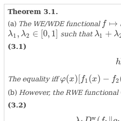 Given two non-negative functions f, g (typically, PM/DFs), define the weighted Kullback-Leibler divergence (or the relative WE, briefly RWE) as Theorem 1.3 from [20] states: