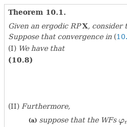 Given an ergodic RP X, consider the WI ${I_{\varphi _{n}}^{\mathrm{w}}}({\mathbf{X}_{0}^{n-1}})$ and the WE ${H_{\varphi _{n}}^{\mathrm{w}}}(\mathbf{p}_{n})$ as defined in (10.2), (10.3). Suppose that convergence in (10.7) holds $\mathbb{P}$-a.s. Then: