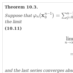 \[\underset{n\to \infty }{\lim }\frac{1}{n}\varphi _{n}\big({\mathbf{X}_{0}^{n-1}}\big)=\alpha ,\hspace{1em}\mathbb{P}\text{-a.s.}\hspace{0.2778em}\text{and/or in}\hspace{2.5pt}\mathrm{L}_{2}(\mathbb{P}).\]Theorem 10.1.
