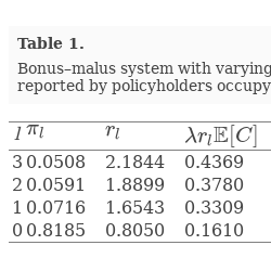 To compute the premium relativities $r_{l}$, we use a quadratic loss function as proposed in [14] (see also [3, 10]). To this end, we minimize the expected squared difference between the “true” relative premium Θ and the relative premium $r_{L}$ applicable to this policyholder after the stationary state has been reached, i.e. we minimize $\mathbb{E}[{(\varTheta -r_{L})}^{2}]$. The solution to this problem is given by