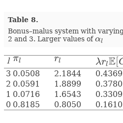 Bonus–malus system with varying deductibles for Example 4 where deductibles are applied to claims of types 1, 2 and 3. Larger values of $\alpha _{l}$