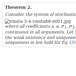 where all coefficients a, α, $\sigma _{1}$, $\sigma _{2}$, and β are nonrandom measurable and bounded functions, $\sigma _{1}$, $\sigma _{2}$, and β are continuous in all arguments. Let $|\rho |<1$, and let $\sigma _{1}(t,x)>0$, $\sigma _{2}(t,y)>0$, $\beta (t,y)>0$ for all $t,x,y$. Then the weak existence and uniqueness in law hold for system (3)–(4), and in particular, the weak existence and uniqueness in law hold for Eq. (3) with Y being a weak solution of Eq. (4).