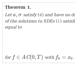 Theorem 1 has the form very similar to the classical Wentzel–Freidlin theorem ([9], Chapter 3, §2), which establishes LDP in a much more general setting, for multidimensional Markov processes that may contain both diffusive and jump parts. However, the Wentzel–Freidlin approach substantially exploits the continuity of infinitesimal characteristics of the process. The natural question arises: to which extent the continuity assumption can be relaxed in this theory. In [5, 6], the LDP was established for multidimensional diffusions with unit diffusion matrix and drift coefficients discontinuous along a given hyperplane; see also [1, 2, 4] for some other results in this direction. In [11], this result, in the one-dimensional setting, is extended to the case of piecewise smooth drift and diffusion coefficients with one common discontinuity point. The technique in the aforementioned papers is based on the analysis of the joint distribution of the process itself and its occupation time in the half-space above the discontinuity point (surface) and is hardly applicable when the structure of the discontinuity sets for the coefficients is more complicated. In [13], the LDP for a one-dimensional SDE with zero drift coefficient was established under a very mild regularity condition on σ: for the latter, it was only assumed that its discontinuity set has zero Lebesgue measure. Extension of this result to the case of nonzero drift coefficient is far from being trivial. In [14], such an extension was provided, but the assumption therein that $a/{\sigma }^{2}$ possesses a bounded derivative is definitely too restrictive. In this paper, we summarize the studies from [13] and [14]; note that the assumption on σ in the current paper is slightly stronger than in [13].