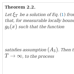 as $T_{n}\to \infty $. Thus, the process ${\beta _{T_{n}}^{(1)}}(t)$ weakly converges, as $T_{n}\to \infty $, to the process ${\beta }^{(1)}(t)={\int _{0}^{t}}g_{0}(\zeta (s))\hspace{0.1667em}ds$, where $\zeta (t)$ is a solution of Eq. (6). Since the subsequence $T_{n}\to \infty $ is arbitrary and since a solution $\zeta (t)$ of Eq. (6) is weakly unique, the proof of Theorem 2.2 is complete.Proof of Theorem 2.3. Consider the function
