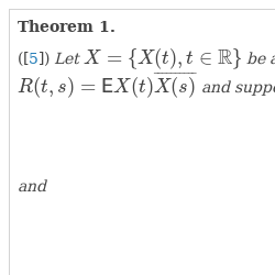 ([5]) Let $X=\{X(t),t\in \mathbb{R}\}$ be a centered random process such that $\mathsf{E}|X(t){|}^{2}<\infty $ for all $t\in \mathbb{R}$. Let $R(t,s)=\mathsf{E}X(t)\overline{X(s)}$ and suppose that there exists a Borel function $u(t,\lambda )$, $t\in \mathbb{R}$, $\lambda \in \mathbb{R}$, such that where and $\xi _{0k}$, $\eta _{jl}$ are centered random variables such that