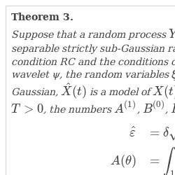 ([13]) Let $X=\{X(t),t\in \mathbb{R}\}$ be a centered stochastic process satisfying the requirements of Theorem 1, $T>0$, ϕ be an f-wavelet, ψ be the corresponding m-wavelet, $S(y)=\overline{\hat{\psi }(y)}$, $S_{\phi }(y)=\overline{\hat{\phi }(y)}$. Suppose that $\phi (y),u(t,\lambda )$, $S(y)$, $S_{\phi }(y)$ satisfy the following conditions: the function $u(t,y)$ is absolutely continuous with respect to y, the function $\hat{\phi }(y)$ is absolutely continuous,