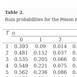 Second example. Suppose now that the three-seasonal discrete-time risk model is generated by three Poison distributions: $Z_{1}$ with parameter $1/2$, $Z_{2}$ with parameter $2/3,$ and $Z_{3}$ with parameter $4/5$. In Table 2, we present the finite-time ruin probabilities for $u\in \{0,1,\dots 10,20\}$, $T\in \{1,2,\dots ,10,20\}$ and the ultimate ruin probabilities for $u\in \{0,1,\dots 10,20\}$. All calculations are made similarly as in the first example.