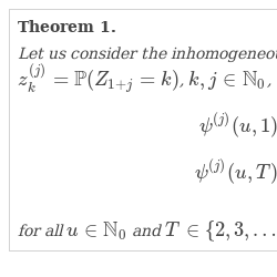 \[\begin{array}{r@{\hskip0pt}l}\displaystyle \psi (u,1)& \displaystyle =1-F_{Z}(u),\hspace{1em}u\in \mathbb{N}_{0},\\{} \displaystyle \psi (u,T)& \displaystyle =\psi (u,1)+{\sum \limits_{k=0}^{u}}\psi (u+1-k,T-1)z_{k},\hspace{1em}\hspace{-0.1667em}u\in \mathbb{N}_{0},\hspace{1em}\hspace{-0.1667em}T\in \{2,3,\dots \}.\end{array}\]