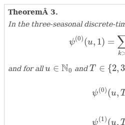 According to this theorem, we can calculate the finite-time ruin probability ${\psi }^{(0)}(u,T)$ of the initial model for all $u\in \mathbb{N}_{0}$ and $T\in \mathbb{N}$. Unfortunately, it is impossible to get formulas for $\psi (u)$ similar to formulas (2) and (3) in the general case because in the case of nonidentically distributed claims, the future of model behavior at each time can be completely new. In paper [4], the general discrete-time risk model was restricted to the model with two kinds of claims. In this model, there are two differently distributed claim amounts that are changing periodically. We call such a model the bi-seasonal discrete-time risk model. In [4] (see Theorem 2.3), the following statement is proved for the calculation of the ultimate ruin probability.