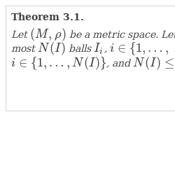 Let $(M,\rho )$ be a metric space. Let $C\in \mathbb{N}$. If for all $r>0$ and for any open ball I with $|I|=8r$, there exist at most $N(I)$ balls $I_{i}$, $i\in \{1,\dots ,\hspace{2.5pt}N(I)\}$ such that $I_{i}\subset I$, $i\in \{1,\dots ,N(I)$, $|I_{i}|=r$, $i\in \{1,\dots ,N(I)\}$, and $N(I)\le C$. Then