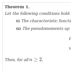 We can see that the condition $\mu _{k}=0$, $3\le k\le r$ supplies the rate of convergence $O({n}^{\frac{-r+1}{2}})$. The rate of convergence was also studied in [1, 3, 7]. In our work, we use a different type of pseudomoments and get the same rate of convergence avoiding the Cramer condition. Instead, we impose the boundedness of the truncated pseudomoments and integrability of the characteristic function.