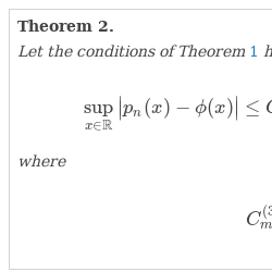 \[\underset{x\in \mathbb{R}}{\sup }\big|p_{n}(x)-\phi (x)\big|\le {C_{m}^{(3)}}\frac{{\nu _{n}^{(1)}}(m)}{{n}^{\frac{m-1}{2}}}+{C_{m}^{(4)}}\frac{{\nu _{n}^{(2)}}(m)}{{n}^{\frac{m-2}{2}}}+{b}^{n-1}\frac{\sigma \sqrt{n}}{2\pi }A+\nu _{n}(m)\frac{{e}^{\frac{3}{2}}}{\pi }\frac{{e}^{-\frac{n}{2}}}{n},\]