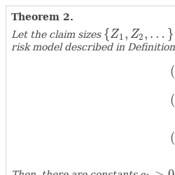 \[\begin{array}{r@{\hskip0pt}l}\displaystyle (\mathcal{C}1)\hspace{2.84544pt}& \displaystyle \underset{i\in \mathbb{N}}{\sup }\mathbb{E}{\mathrm{e}}^{\gamma Z_{i}}<\infty \hspace{1em}\textit{for some}\hspace{2.5pt}\gamma >0,\\{} \displaystyle (\mathcal{C}2)\hspace{2.84544pt}& \displaystyle \underset{u\to \infty }{\lim }\underset{i\in \mathbb{N}}{\sup }\mathbb{E}\big(\theta _{i}\mathbb{1}_{\{\theta _{i}>u\}}\big)=0,\\{} \displaystyle (\mathcal{C}3)\hspace{2.84544pt}& \displaystyle \underset{n\to \infty }{\limsup }\frac{1}{n}{\sum \limits_{i=1}^{n}}(\hspace{0.1667em}\mathbb{E}Z_{i}-c\mathbb{E}\theta _{i})<0.\end{array}\]