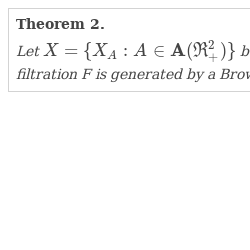 Let $X=\{X_{A}:A\in \mathbf{A}({\mathrm{\Re }_{+}^{2}})\}$ be a set-indexed Brownian motion with variance σ (Lebesgue measure). Then, for $A\in \mathbf{A}$, is a set-indexed Brownian motion with variance σ.