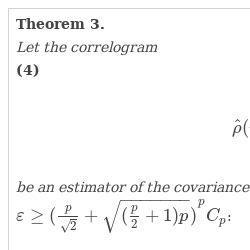 \[\hat{\rho }(\tau )=\frac{1}{T}\underset{0}{\overset{T}{\int }}X(t+\tau )X(t)dt,\hspace{1em}0\le \tau \le A,\] \[P\bigg\{\underset{0}{\overset{A}{\int }}{\big(\hat{\rho }(\tau )-\rho (\tau )\big)}^{p}d\tau >\varepsilon \bigg\}\le 2\sqrt{1+\frac{{\varepsilon }^{1/p}\sqrt{2}}{{C_{p}^{\frac{1}{p}}}}}\exp \bigg\{-\frac{{\varepsilon }^{\frac{1}{p}}}{\sqrt{2}{C_{p}^{\frac{1}{p}}}}\bigg\},\]