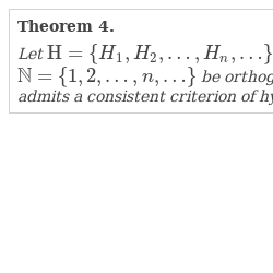 The family of probability measures $\{\mu _{H},\hspace{0.2778em}H\in \mathrm{H}\}$ is said to admit a consistent criteria of a hypothesis if there exists at least one measurable map $\delta :(E,S)\to (\mathrm{H},\mathrm{B}(\mathrm{H}))$, such that $\mu _{H}(\{x\mid \delta (x)=H\})=1$, for all $H\in \mathrm{H}$.