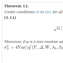 Note that due to conditions (vii) and (viii), Theorem 12 is valid for all non-random shifts $\varphi \in {\mathbb{R}}^{k}\times Lip_{1}([0,\tau ])$, where $Lip_{1}([0,\tau ])$ is a class of Lipschitz continuous functions. Take the shift as follows: $\varphi =({\varphi _{\beta }^{\mathsf{T}}}a(u)K(u),\varphi _{\beta })$, where $\varphi _{\beta }$ is a fixed vector of ${\mathbb{R}}^{k}$. For this shift one can rewrite $\langle {Q^{\prime }_{n}}(\theta _{0}),\varphi \rangle $ as