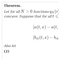 Let for all $N>0$ functions $q_{N}(r)$, $\rho _{N}(r)$, $r\geqslant 0$ are nondecreasing and continuous and additionally $q_{N}(r)$ is concave. Suppose that for all $t\leqslant N$, $|x|\leqslant N$, $|y|\leqslant N$ the following inequalities hold true with probability 1