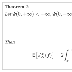 \[ \mathsf{E}\big[{J_{\infty }^{x}}(f)\big]=2{\int _{x}^{+\infty }}\frac{f(u)}{a{(u)}^{2}}\varPhi (u,+\infty )du+2\varPhi (x,+\infty ){\int _{-\infty }^{x}}\frac{f(u)}{a{(u)}^{2}}\varphi (u,x)du.\]