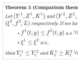 Since $\delta _{s}\le 0$ and $|\zeta _{s}|\le {a}^{2}(s)$, one can derive that It follows that ${\bar{Y}_{t}^{+}}=0$, i.e ${Y_{t}^{1}}\le {Y_{t}^{2}}$ for all $t\le T$ a.s. □